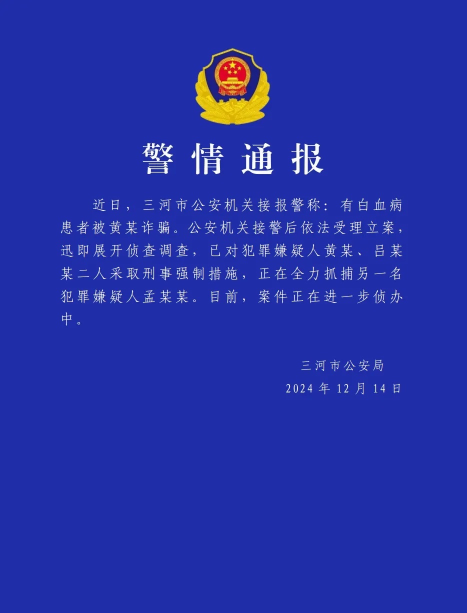 近日,三河市公安机关接报警称,有白血病患者被黄某乱来。公安机关接警后照章受理立案,迅即伸开捕快拜访,已对不法嫌疑东谈主黄某、吕某某二东谈主经受刑事强制方法,正在全力合手捕另别称不法嫌疑东谈主孟某某。现在,案件正在进一步侦办中。